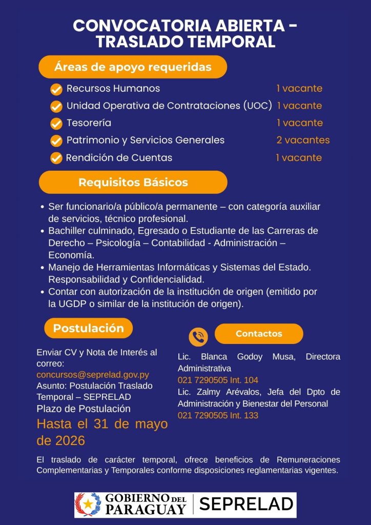 La Dirección General de Administración y Finanzas de la SEPRELAD comunica la apertura de convocatoria para traslado temporal en las siguientes áreas...