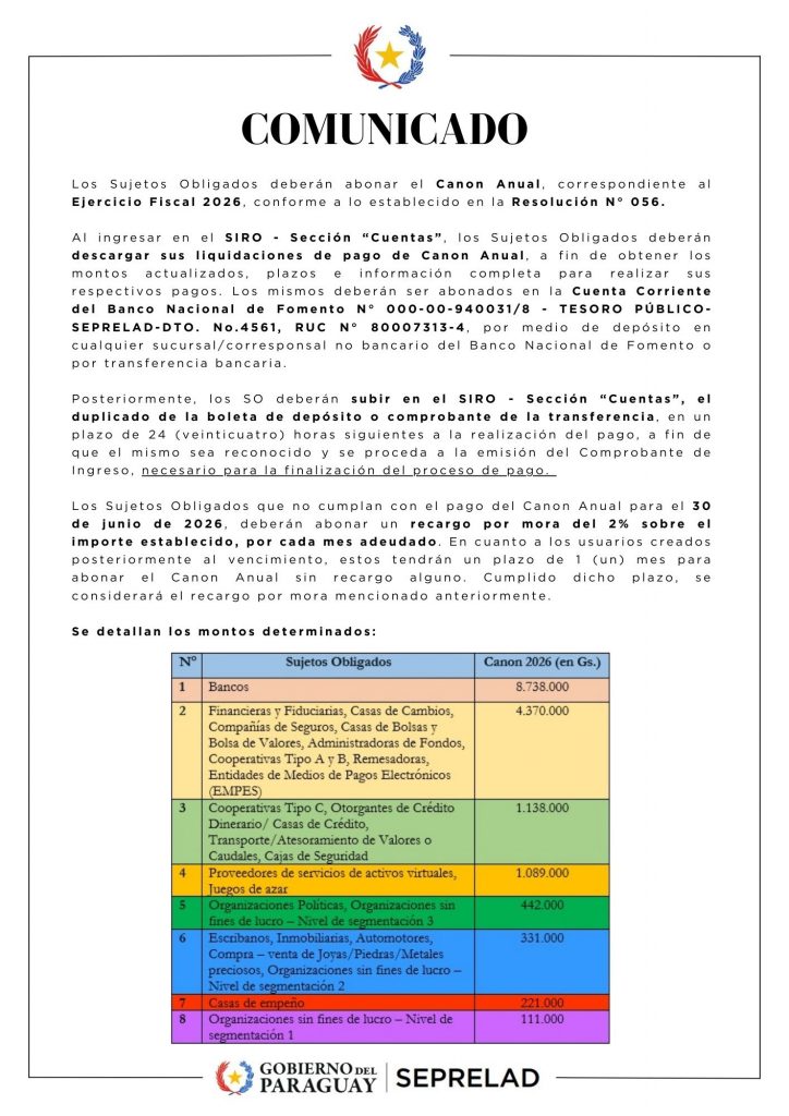 LA SEPRELAD RECUERDA A LOS SUJETOS OBLIGADOS EL PAGO DE CANON ANUAL