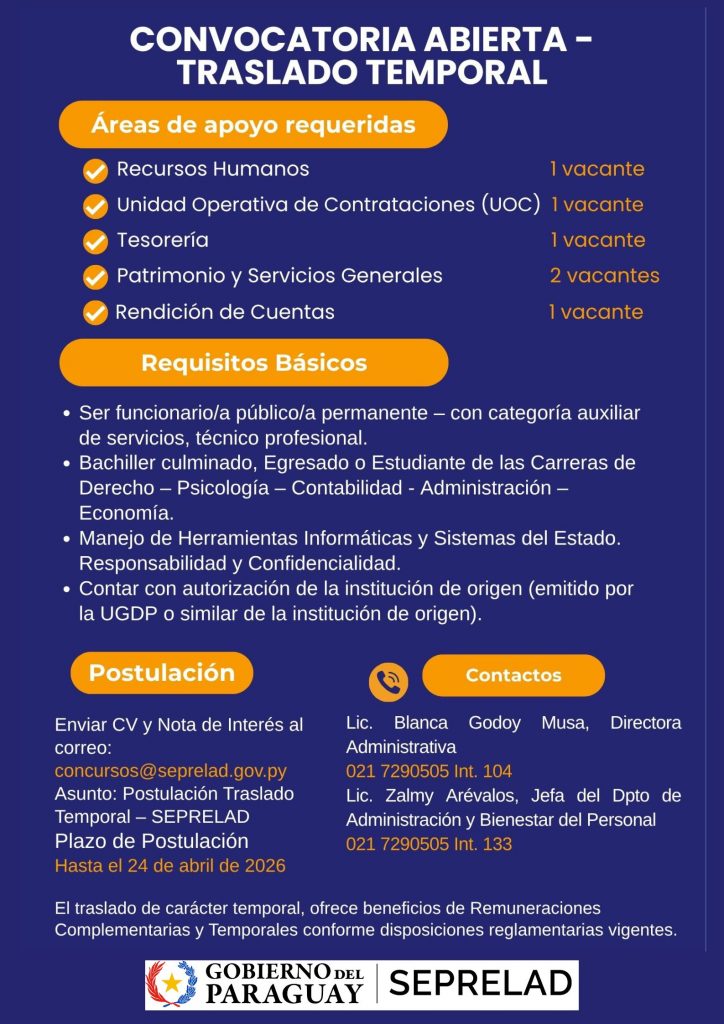 La Dirección General de Administración y Finanzas de la SEPRELAD comunica la apertura de convocatoria para traslado temporal en las siguientes áreas...